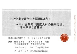 ご存じのとおり、地方都市には、留学生には名前の知られていない優良企業が上場企業をはじめ、多くの中小企業が存在しています。そうした企業は主に、B to Cの企業ではなく、B to Bの企業が多いということ。また、そうした企業を知り、人的ネットワークを築いていくことの重要性、またそうした企業の①調達、②生産、③販売、④サービス、⑤人的資源管理等のバリューチェーンの各段階でグローバル化が進んでいる企業あるいはこれから進めようとしている企業の情報をつかみ、自分の貢献できる領域を見える化し、アピールしていくことの重要性をお伝えしました。